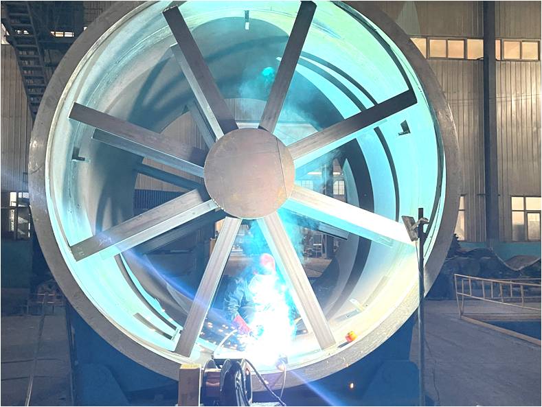 重點(diǎn)項(xiàng)目φ3.2×24m干燥機(jī)在重型成套廠鉚焊車間全速推進(jìn),生產(chǎn)現(xiàn)場火光四濺,生產(chǎn)氣氛一片火熱